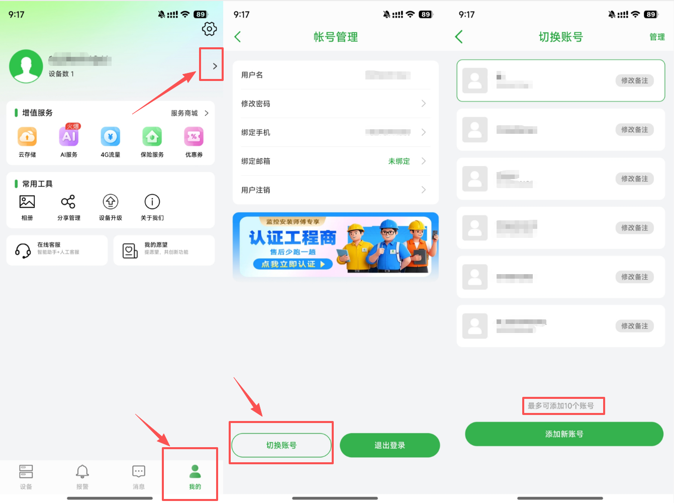 您好,APP进入点击我的——账号头像这——切换账号即可,如没有该功能请将设备升级到最新版本。app内添加新账号,添加成功后,可直接在该界面选择对应账号登录,无需再次输入账号密码。【安卓最新版本,苹果最新版本目前最多支持存储10个账号】