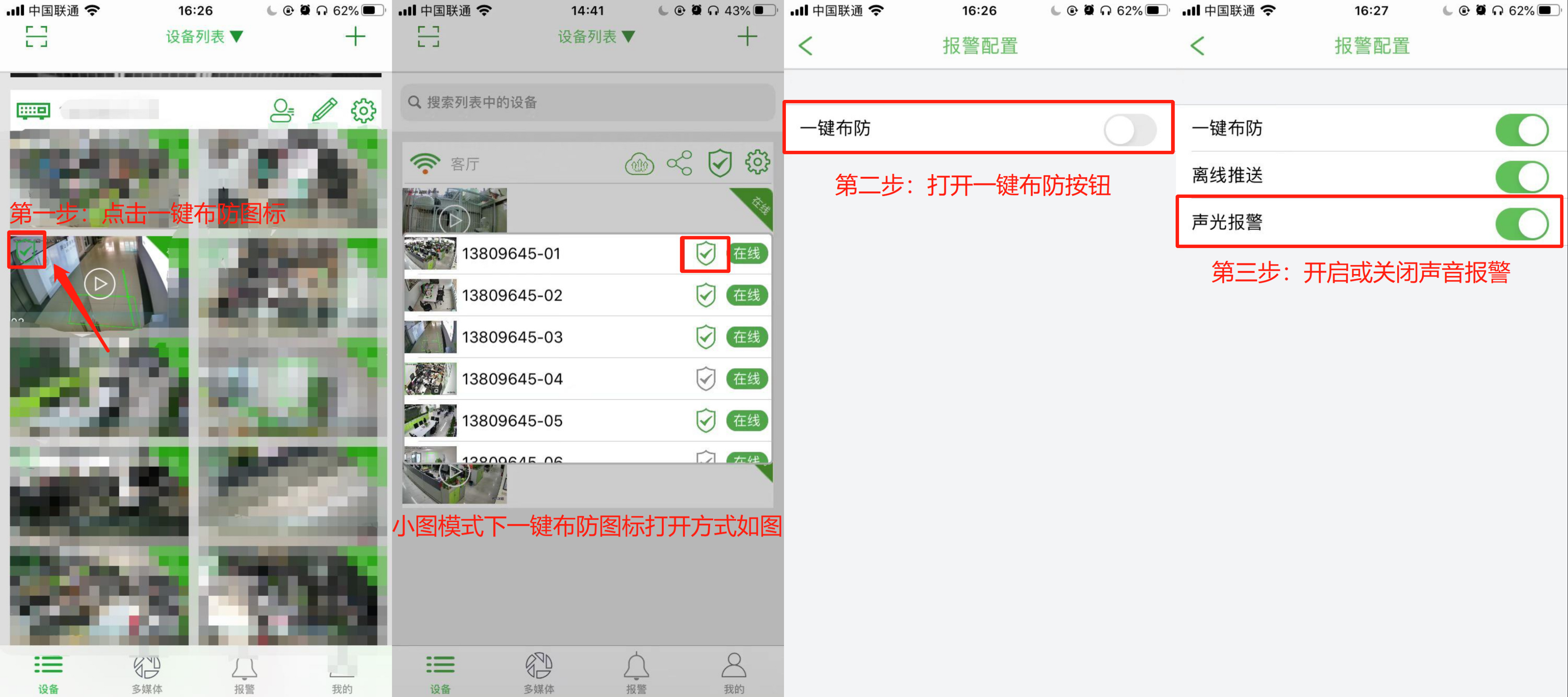 设备列表界面点击“一键布防”图标——打开“一键布防”开关,可设置开启或关闭声光报警。