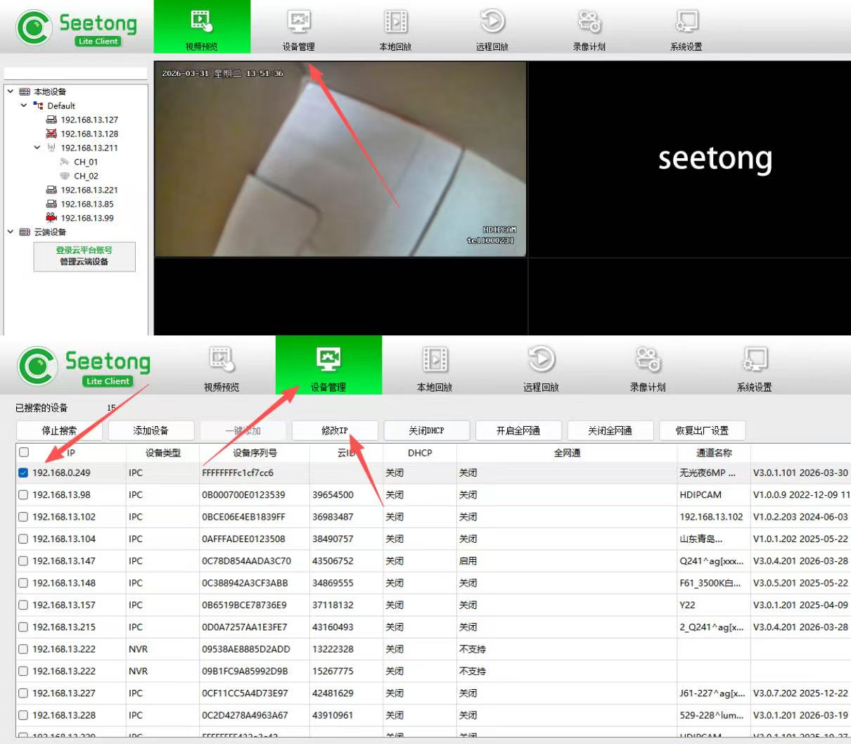 登录Seetong电脑客户端————设备管理——搜索设备——在搜索到的设备中勾选需要修改IP的设备——点击修改IP——修改之后确定即可。