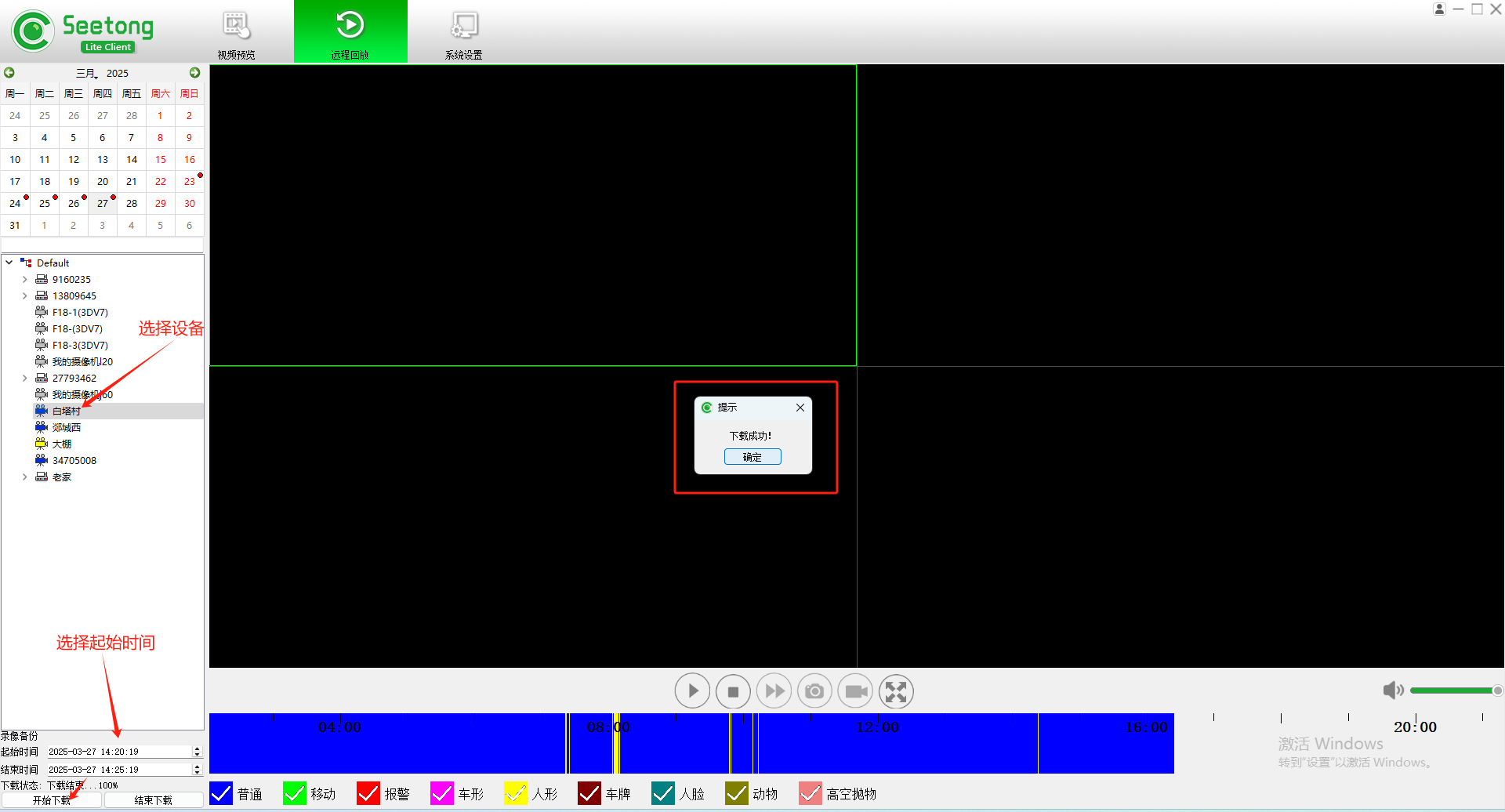 下载电脑端云平台登录:第一步:双击选中需要备份的设备确认画面可以正常预览第二步:进入远程回放界面中双击选中需要备份的设备,出现进度条说明有回放,点击选择对应日期和录像起止时间,然后点击开始下载