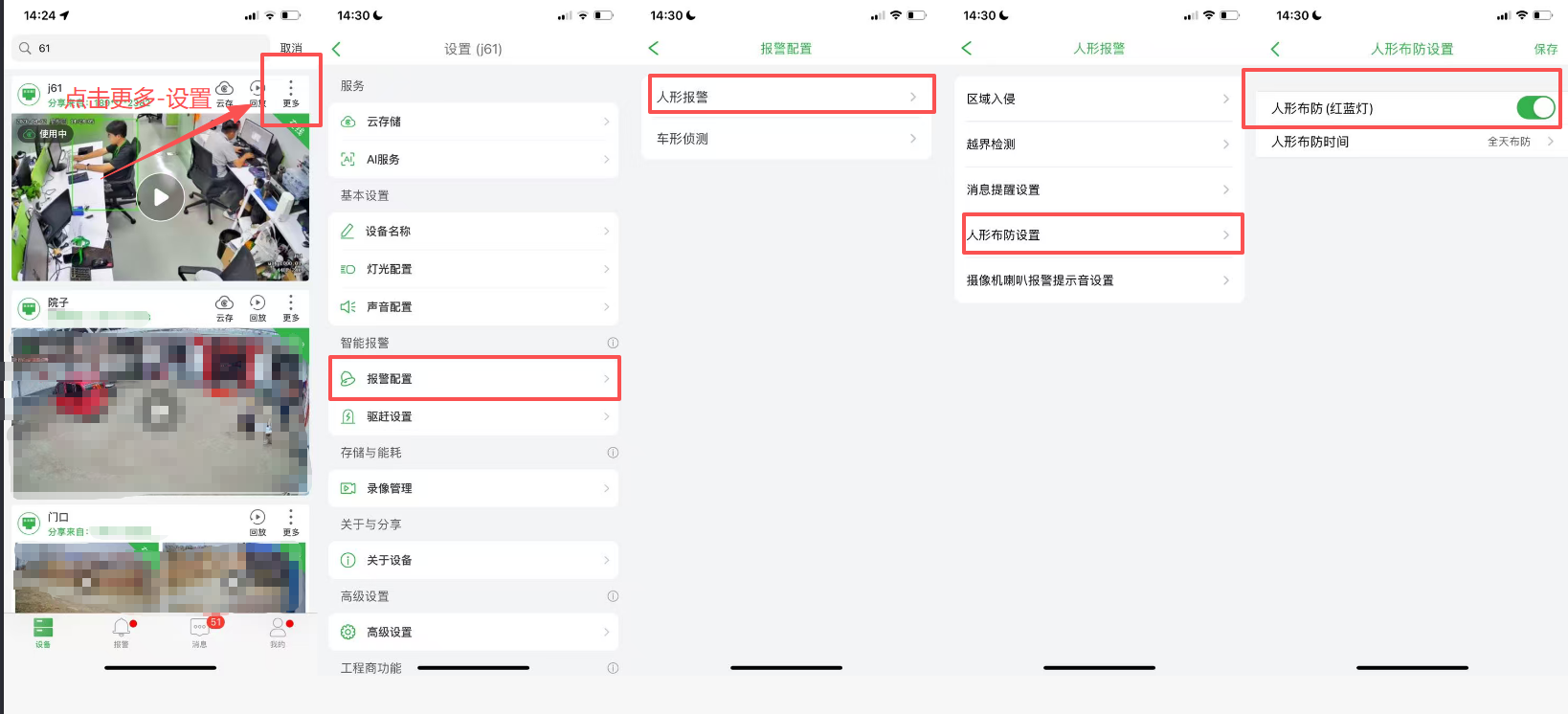 PC客户端操作:电脑端本地登录连接成功设备后,视频预览--点击IP--鼠标右键--远程配置--智能分析--人形侦测--区域入侵/越界侦测--红蓝灯(开启/关闭),注意:客户端版本需要更新1.0.8.3版本才支持电脑操作开启和关闭红蓝灯功能;