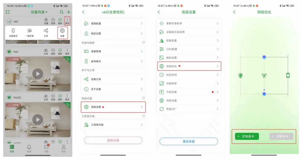 如果没有网络优化按钮的,说明是老型号单卡设备,不支持切换。 可以试一下自己换其他运营商的流量卡,普通的手机流量卡就可以使用,把流量卡插入到设备的外置卡卡槽里面,看下实时预览情况,外置卡安装是需要打开摄像头机壳,卡槽位置一般在设备的芯片上。