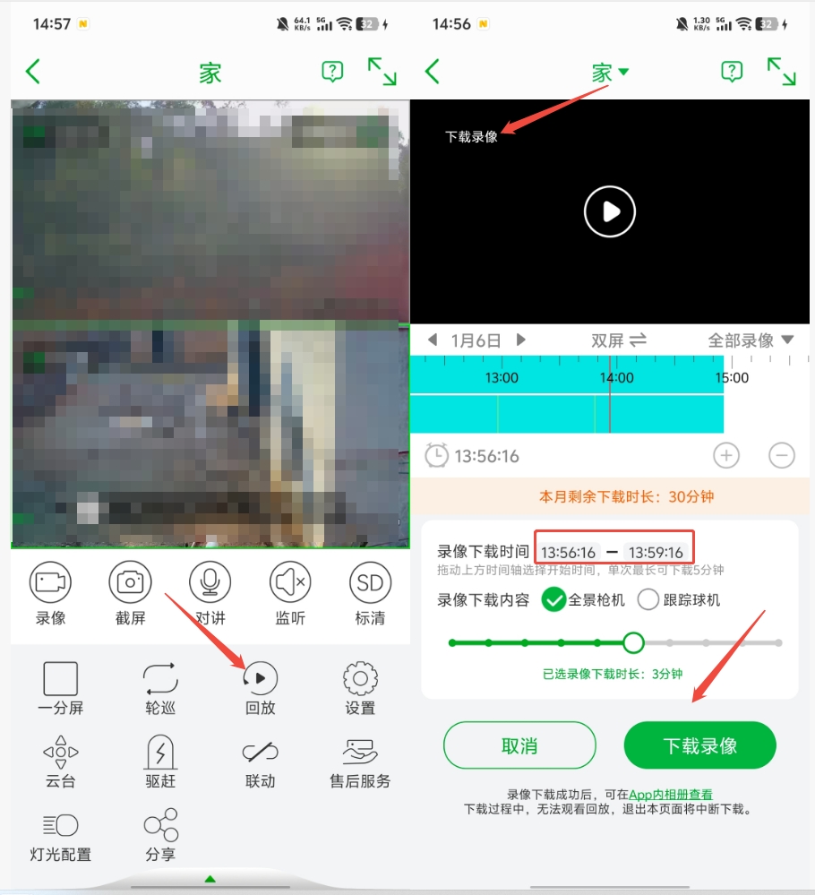 您好,目前APP最新版本支持卡录像下载,每用户每月可下载30分钟,单词最多下载5分钟。如需要更长下载时间,建议手动录屏或者拔除内存卡备份,以及电脑客户端进行下载回放。